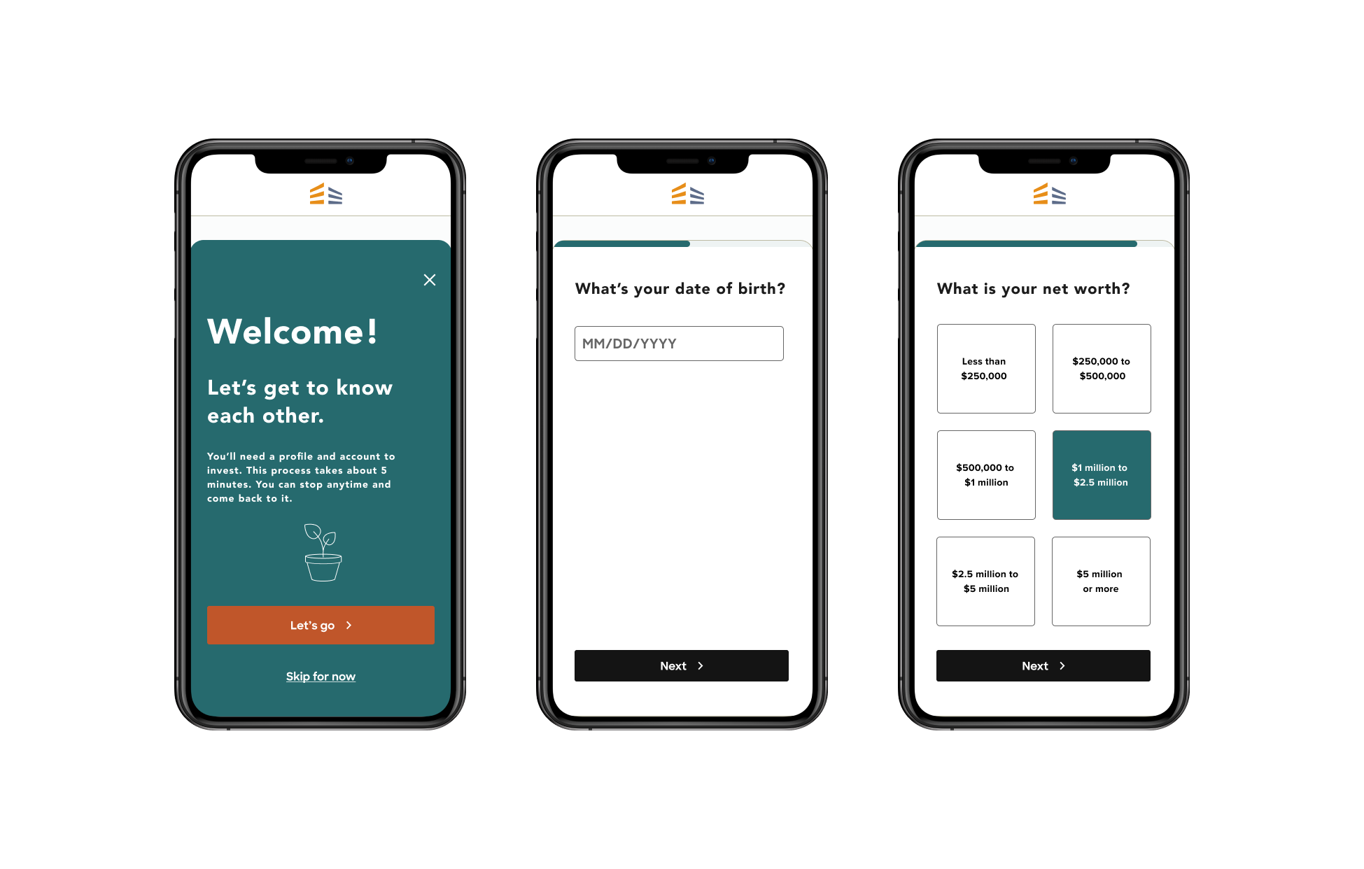 The strategy of this onboarding and account creation flow is to make it optional up front but encouraged. I want the user to feel like they have the control to look at the app’s investment opportunities and see the value of filling out all the necessary information. The purpose of collecting the information should be well communicated. Whatever the user enters should be saved, and no information should be entered twice. I want the user to fill out the required information because it’s the simplest option, not because they feel like they have to.